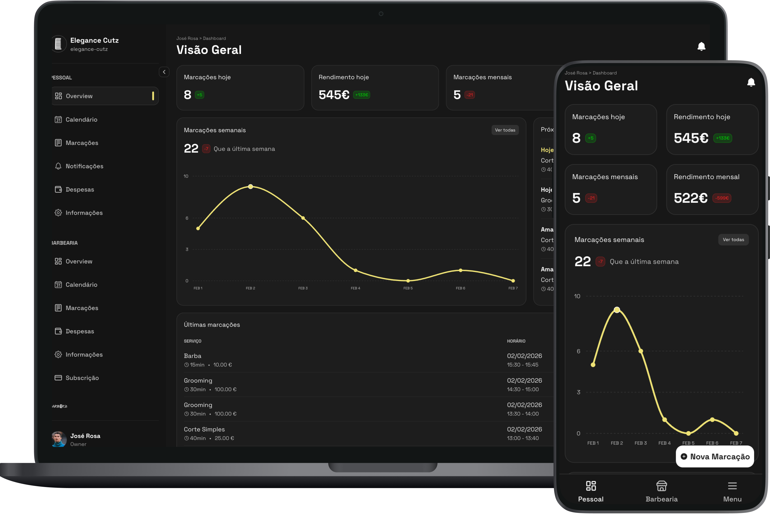 Os clientes marcam online e tu recebes tudo organizado no dashboard.